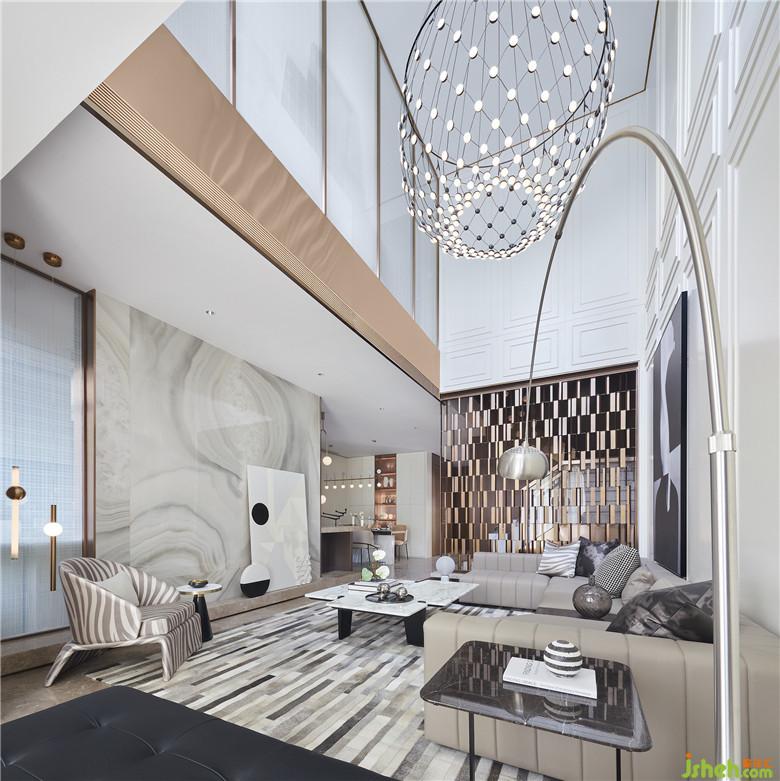 設(shè)計元素的呼應(yīng)與融合在此運用嫻熟:客廳兩端立面的畫作,均由黑白灰三色演繹,以簡約的筆觸勾勒藝術(shù)感知;背景線板與沙發(fā)都極具體塊與線條韻律,后方非常規(guī)尺寸的畫作將人的視線自然引向上方,銜接之余又散發(fā)出一種不可言說的魅力;條塊狀金屬屏風(fēng)衍生的錯位分割感,也在兩幅畫作、茶幾、牛皮拼接地毯上得到體現(xiàn)。