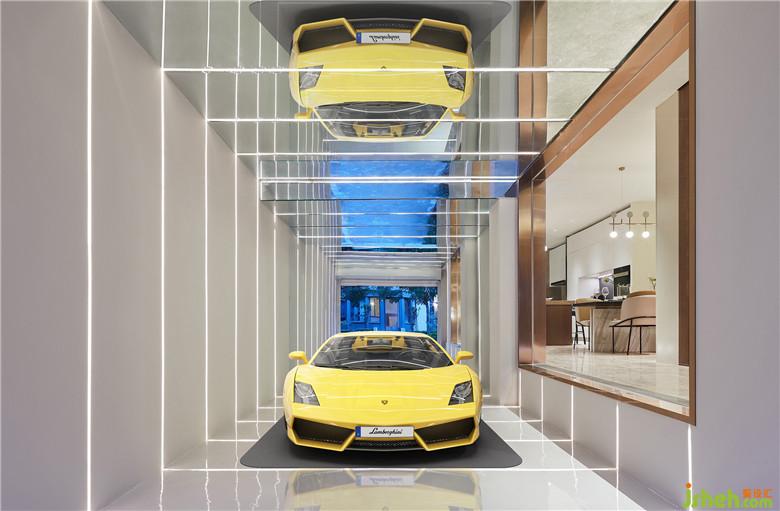 車庫借由立面與頂面的鏡面反射,與LED燈帶一起,構(gòu)筑虛實層疊與縱深擴(kuò)容的效果,科技感十足。透過右側(cè)玻璃與餐廳、過道互動,車庫化身精美展廳,并成為室內(nèi)頗具玩味的一景。