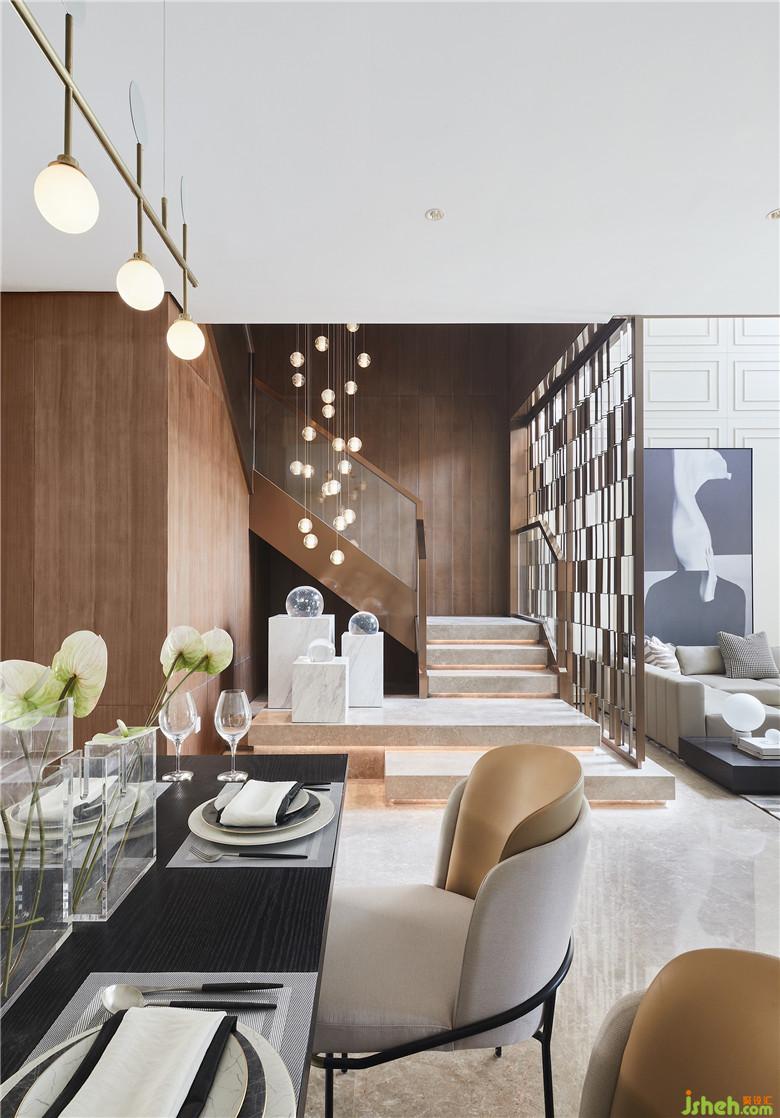 不同的材質(zhì)、造型、色澤于餐廳交織,錯落有致,立面沿用大塊面線板充當(dāng)最適宜的調(diào)色板,渲染出典雅且輕松的用餐環(huán)境。