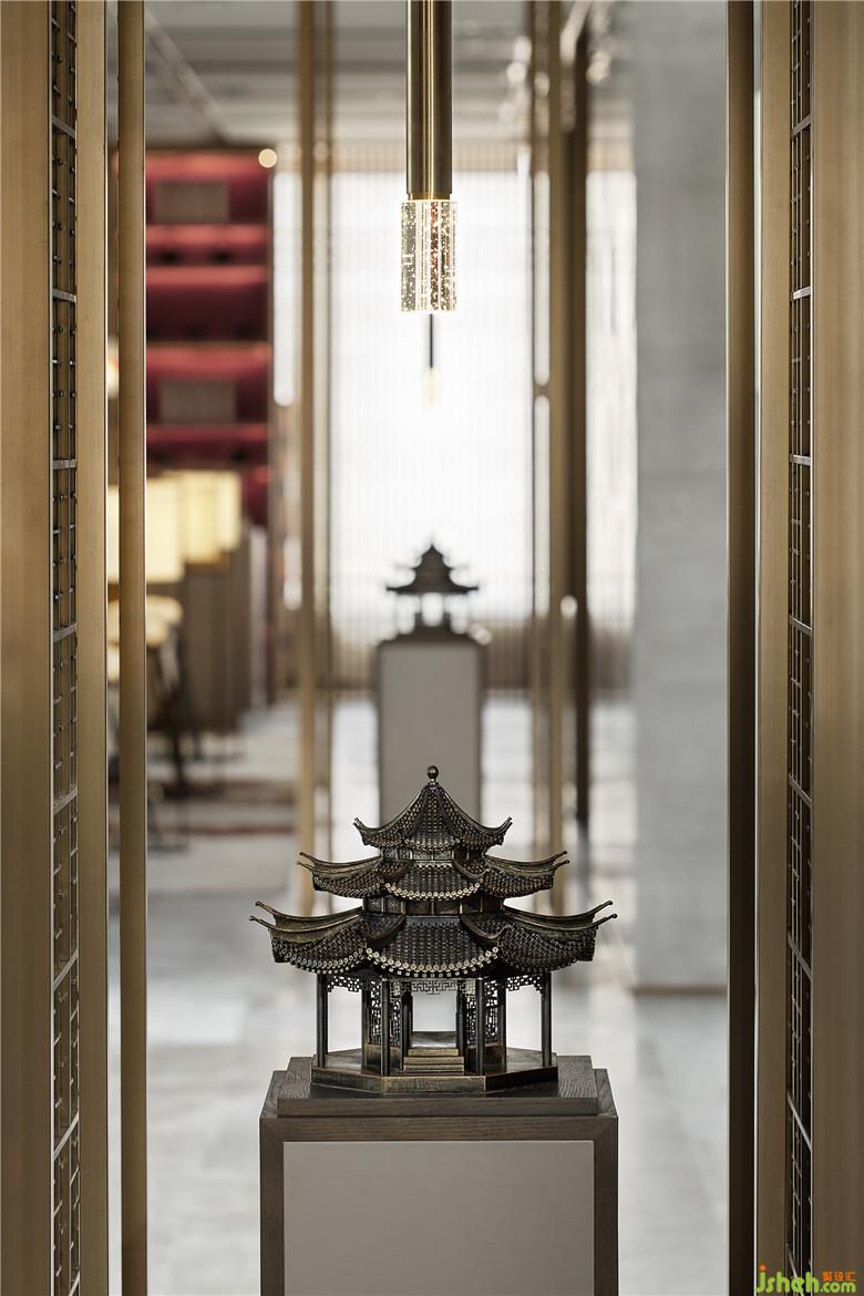 此外,八角亭作為官宅的建筑小品,自然也是不可或缺。設(shè)計(jì)師將黃鶴樓前的八角亭植入室內(nèi),運(yùn)用3D打印技術(shù),表面作特殊的工藝處理,實(shí)現(xiàn)古銅金屬材質(zhì)的表達(dá),詮釋出現(xiàn)代與傳統(tǒng)、傳承與發(fā)展的融合。