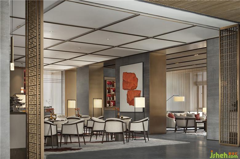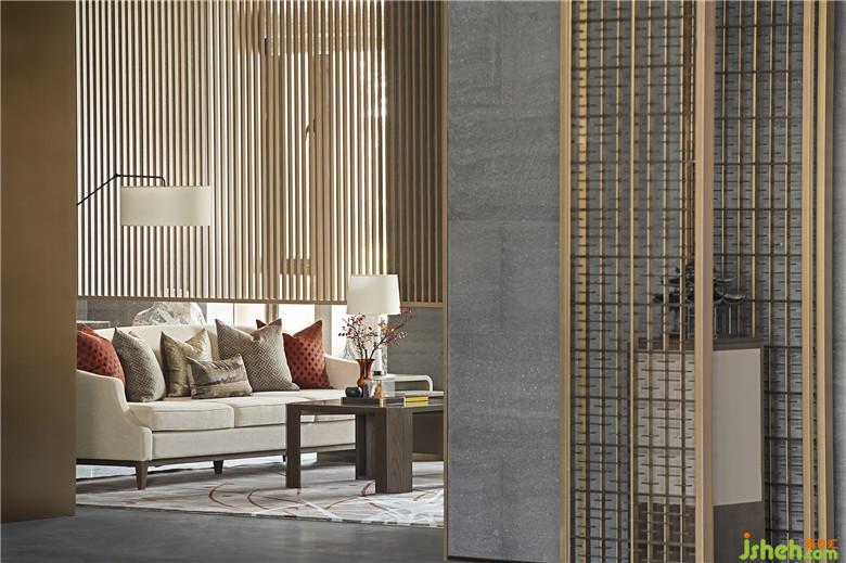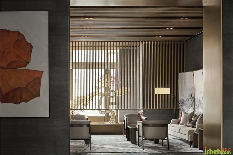 緊鄰淺度洽談區(qū)的一側(cè),設(shè)立深度洽談區(qū)與品茗區(qū),在半開(kāi)敞半私密的復(fù)合型布局中,木格柵材質(zhì)以橫豎并存的姿態(tài)出現(xiàn),更具韻律節(jié)奏。此外還引入園林造景技法,虛透中亦可一窺山石松林,領(lǐng)略到“窗前有風(fēng)景、心中有山水、茶中有天地”。