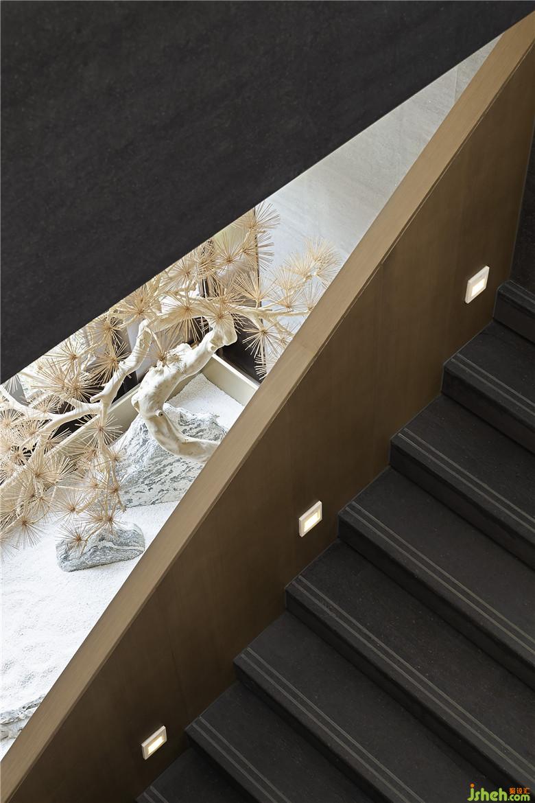 樓梯作為一層和二層VIP室的重要連接,強(qiáng)調(diào)建筑感,在一隅打造景觀顯露禪意,通過木飾面包裹更具整體性,簡潔有序,又釋放古雅風(fēng)韻。