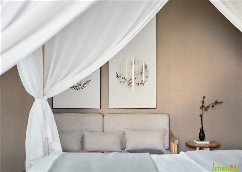 白色紗幔隨風(fēng)飄然而起,隨畫(huà)作與插花對(duì)話古今,在看似無(wú)意間氤氳著從容自如的淡雅之韻。枕水而息,坐擁太湖風(fēng)光又將人文意境帶入其中,返璞歸真的境地莫過(guò)如此。