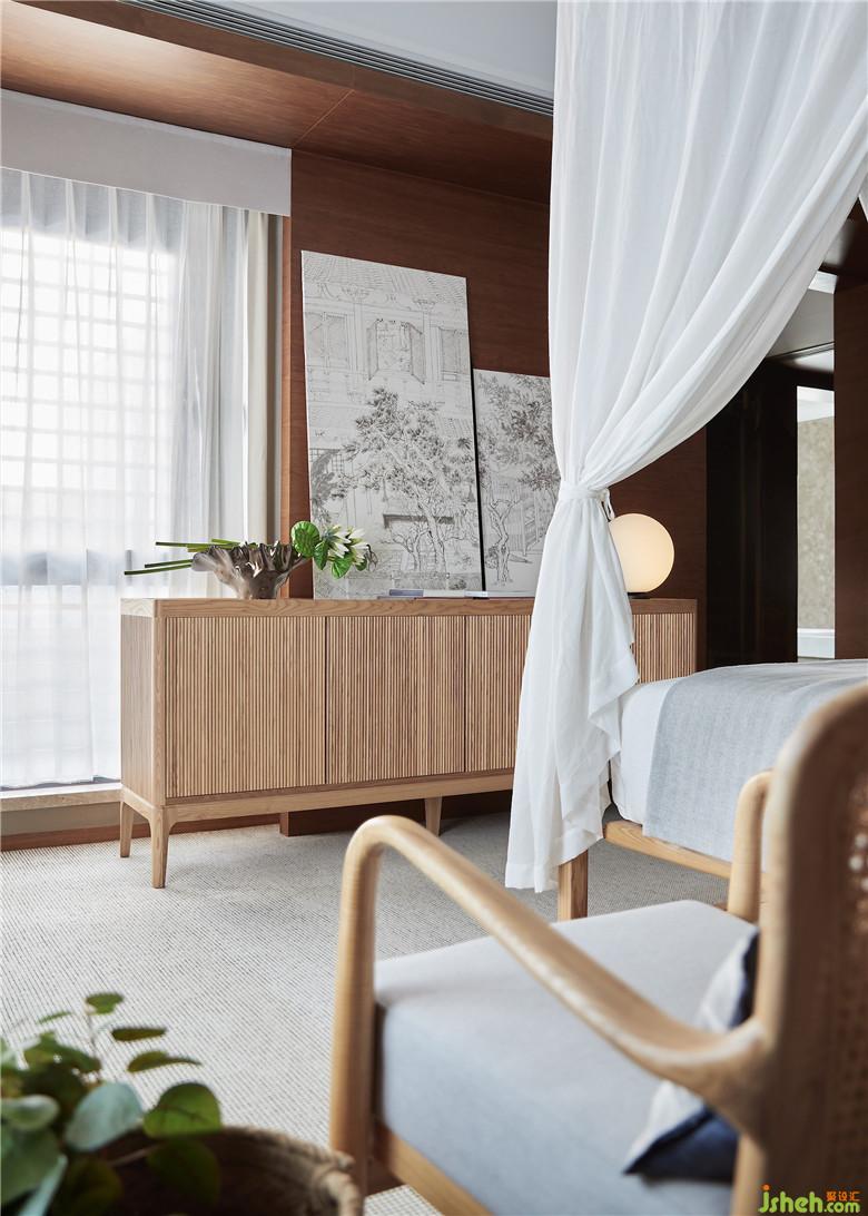 二樓主臥充分利用采光,參照酒店式起居場(chǎng)景,“人”字型屋頂配上架子床,空間感更強(qiáng),也進(jìn)一步映射出東方氣息以及度假風(fēng)情。
