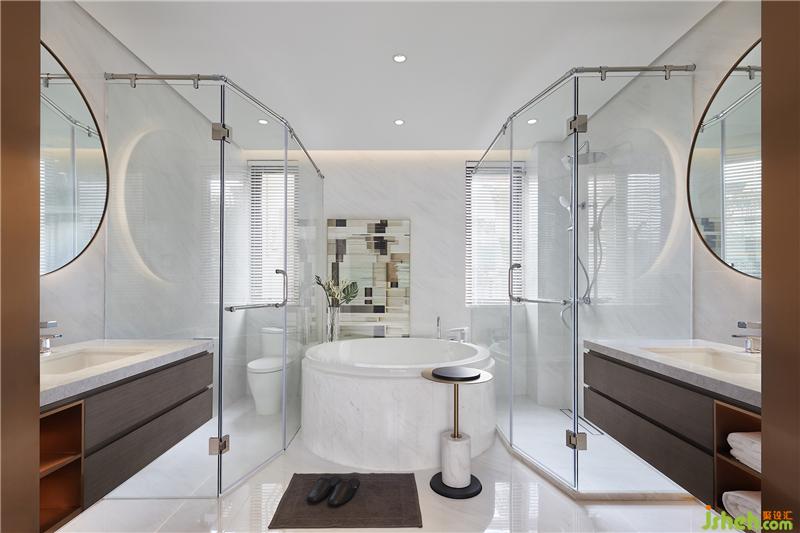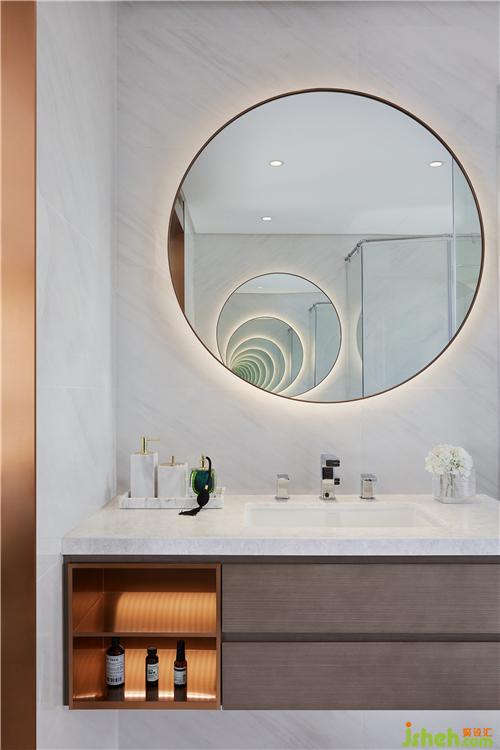 主衛(wèi)遵循對稱手法,矩形體塊與圓弧形態(tài)有機搭配,其背后則是依據人在場景中的功用及感受來排布。加上對細節(jié)、造型、燈光的謹慎把握,共同演繹大氣格調。售樓處設計