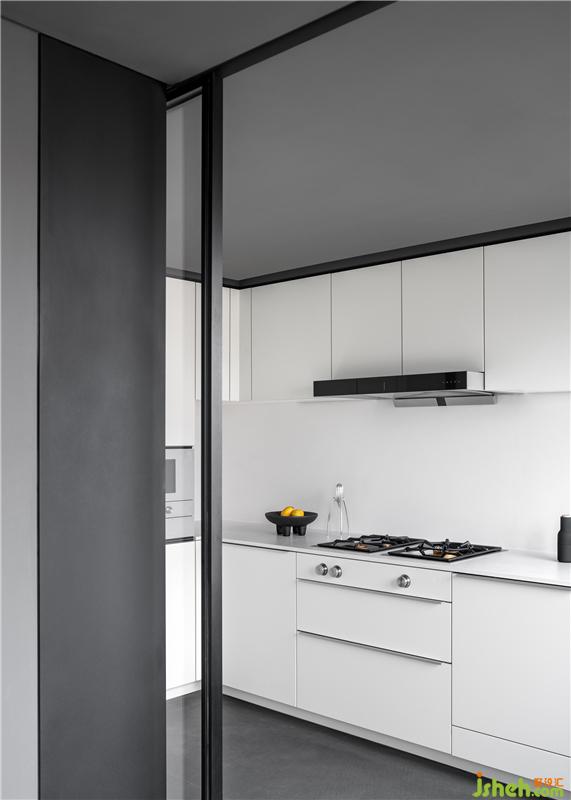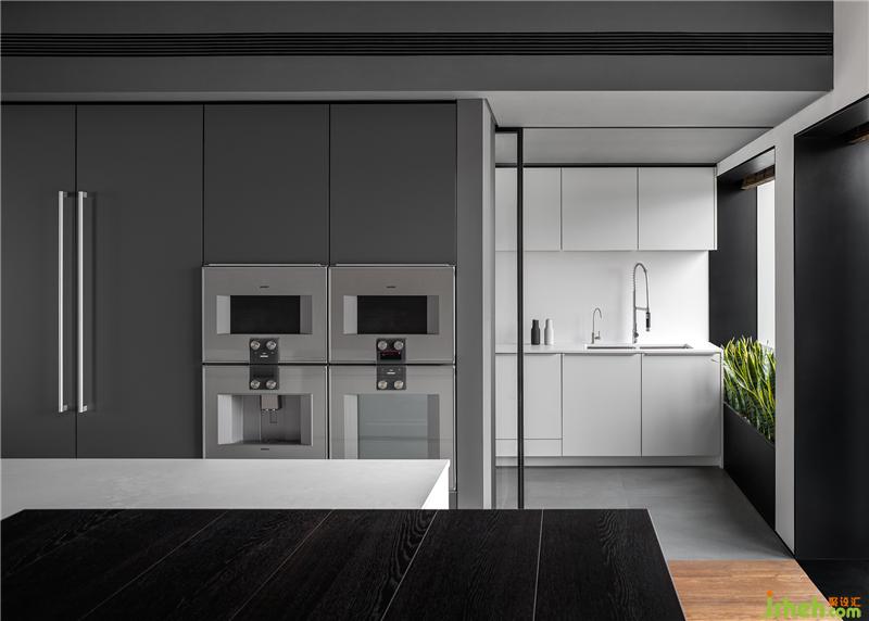 中廚同樣延續(xù)與島臺(tái)區(qū)的貫通,基于使用場(chǎng)景與習(xí)慣,設(shè)置暗藏式玻璃移門,來實(shí)現(xiàn)開合之道的隨心轉(zhuǎn)變,這也是設(shè)計(jì)師對(duì)功效和意義上的雙重平衡,對(duì)家庭成員情感互動(dòng)的又一細(xì)節(jié)處理。其中蘊(yùn)含的層次變化盡顯干凈利落,又不乏其獨(dú)特的張力。