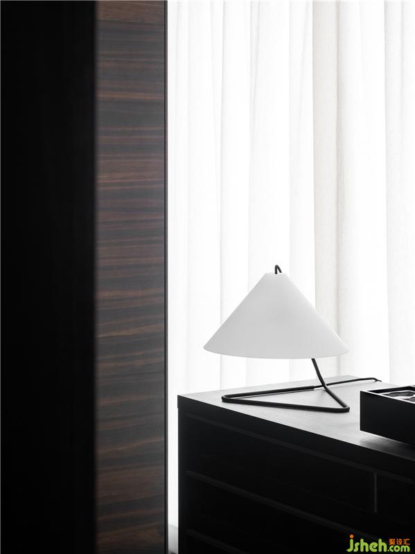 豪宅之所以“豪”,非但在于“大”,豐富的細(xì)節(jié)亦理應(yīng)值得考究。主臥在點(diǎn)線面的排布中有著熟稔自如的轉(zhuǎn)換,在黑白灰的圍合中飽含深情。床頭采用方磊慣用的三角構(gòu)成手法,既打破對(duì)稱式單調(diào),又構(gòu)成了入室的視覺落點(diǎn)。所選取的燈飾本身也滲透著設(shè)計(jì)師的精巧心思,與臥室渾然相融,增添一抹柔情的點(diǎn)睛之筆。