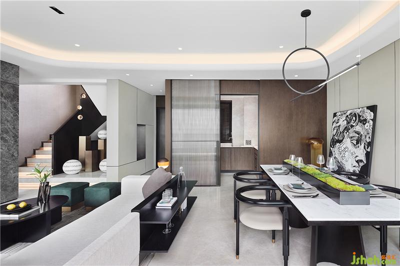 廚房以木盒子體塊打造而成,玻璃移門在開合之間,保證區(qū)隔的同時又呈現(xiàn)出多種材料的碰撞之美,給人以無限遐想。復式裝修設計