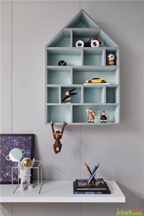 兒童房借由不同的藍綠搭配呈現(xiàn)出豐富的層次效果,無論是床頭柜,還是墻面裝置、懸浮小屋,無不流露出對積木拼接的活化運用。構(gòu)筑起這個歡樂的童話王國,讓其搭載孩童稚嫩而精彩的夢,為未來描繪無限暢想。