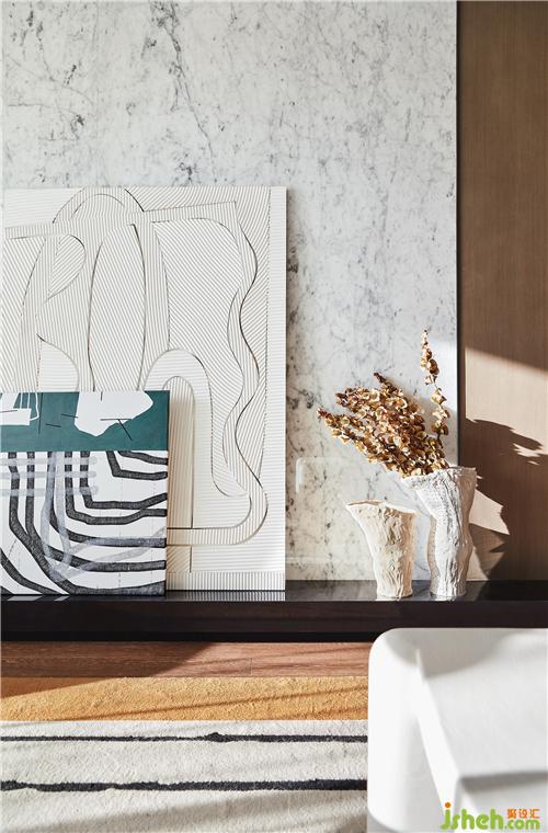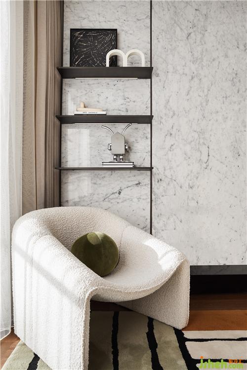 背景墻由木飾面到石材的轉(zhuǎn)變,也意味著場(chǎng)所的步步深入。同時(shí)將金屬板嵌入,極具特色的置物格架亦由此而生。多種材料的冷暖調(diào)和,在色彩與幾何元素的融合碰撞中,構(gòu)筑優(yōu)雅格調(diào)。