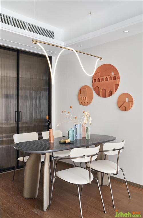 餐廳以獨(dú)特的線性吊燈和鮮明的陳設(shè)配色,統(tǒng)籌尺寸及舒適度的考量,層次感與趣味性隨即而出,溫馨的用餐故事于此展現(xiàn)。