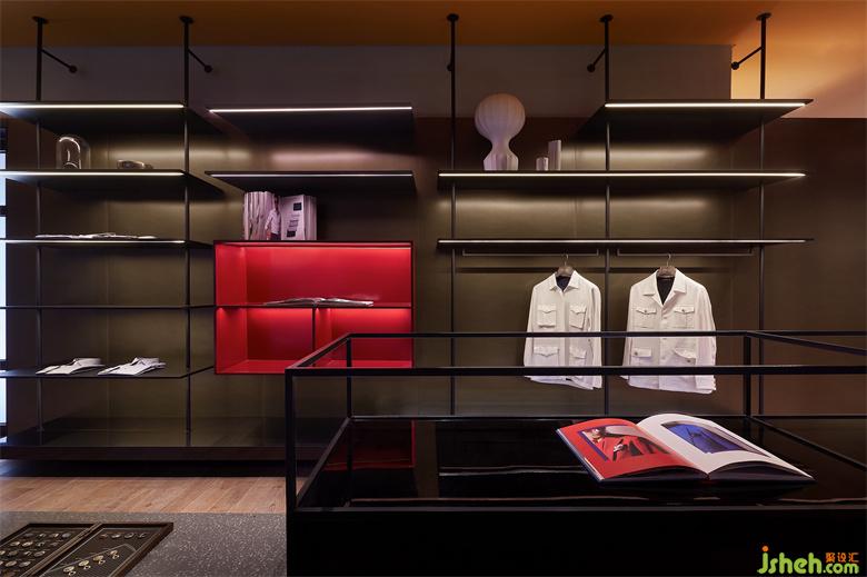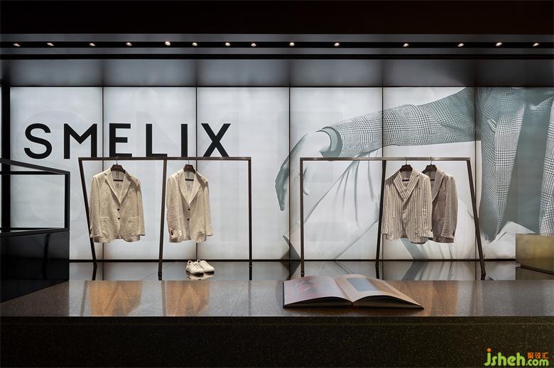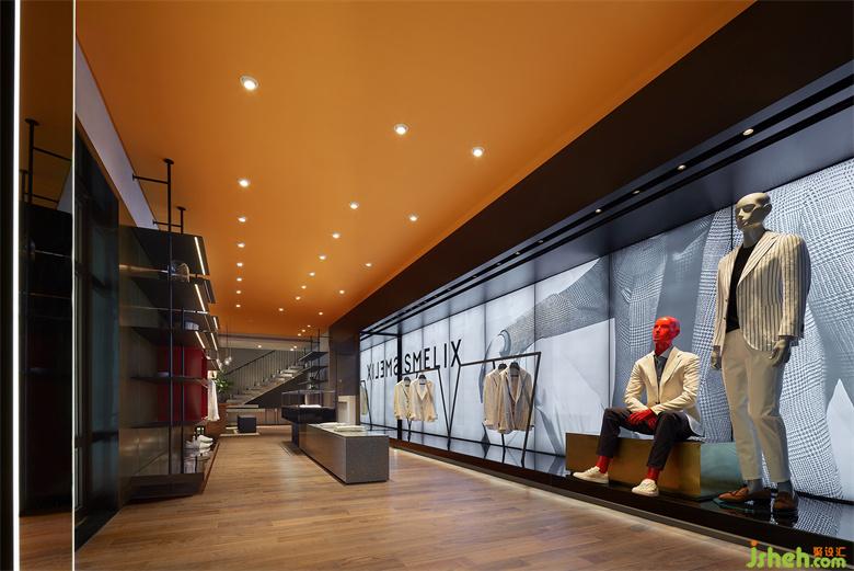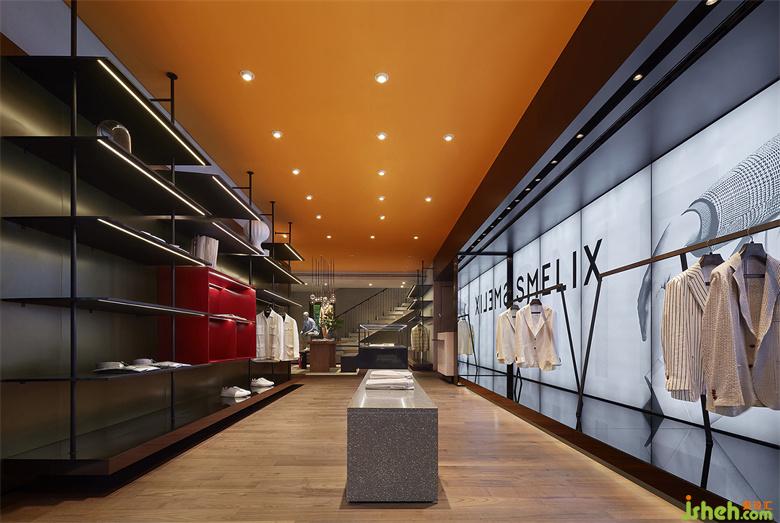 男裝店鋪設計以內凹的BOX體塊,結合大面燈箱的使用,構造出室內櫥窗之感。根據(jù)前端的產(chǎn)品陳列樣式,亦可對燈箱實行全色域控制,使二者協(xié)調契合,另一方面也預留更多的可塑性。