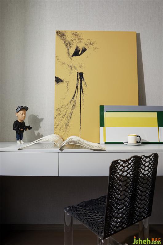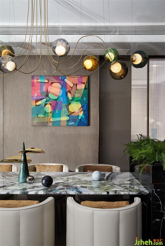 室內(nèi)各種色澤的運(yùn)用,似乎都可從餐廳背景墻上的畫作《光的呈現(xiàn)》里得以溯源,以抽象的筆觸描繪出具象的有序與變化,也增添一抹矚目且歡暢的光芒。目之所及,錯落有致的關(guān)系、直線弧度的碰撞、剛?cè)峒鏉?jì)的包容,共同助力藝術(shù)的高雅與生活的煙火氣和諧交融。