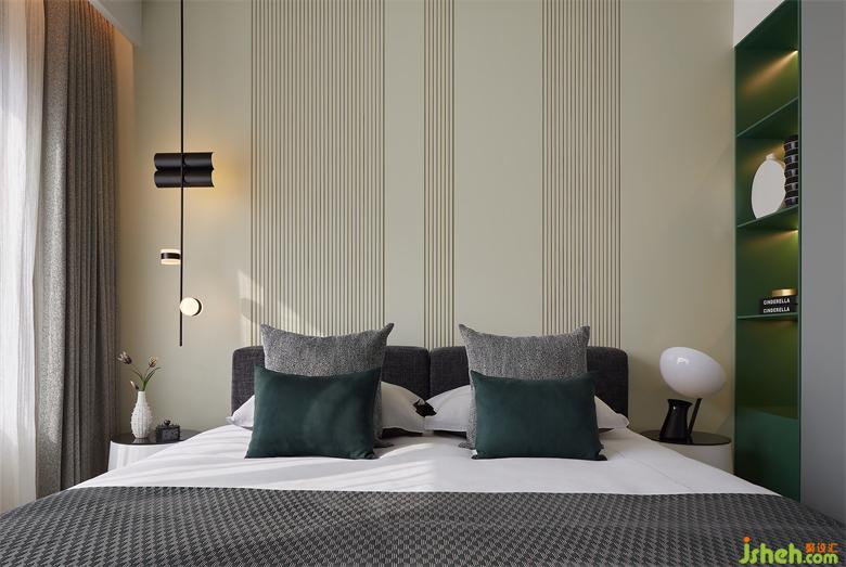 主臥床背景以質(zhì)樸有序的線條加上適當(dāng)?shù)牧舭祝瑯O富韻律,給人松弛平靜之感。樣板間設(shè)計(jì)半懸浮的床體工藝頗為考究,打破常規(guī)認(rèn)知,在承重與輕盈的最大化平衡中,帶來無限暢想與別樣情趣。