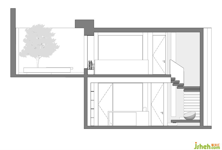 地下層內(nèi)庭院自成一方靜謐天地,素雅干練的用材與水景園林交相輝映,滌蕩開無盡的人文雅趣。在藝術(shù)的構(gòu)造下,建筑本身與周圍環(huán)境和諧交融,恍如遁回桃花源,忘卻世間塵與煩?;勇?lián)通中,可謂室內(nèi)戶外,各有風(fēng)韻。