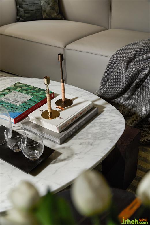 尺度闊綽從容,動(dòng)線優(yōu)雅流暢,愜意之感自客廳撲面而來(lái)。電視背景墻以木飾面和皮革做拼接,層次感十足,軟裝陳設(shè)亦強(qiáng)調(diào)功用,南京樣板間設(shè)計(jì)拒絕過(guò)多裝飾,加以色彩、肌理的呼應(yīng),干練利落,也呈現(xiàn)出理性的輕奢調(diào)性和高雅的審美體驗(yàn)。