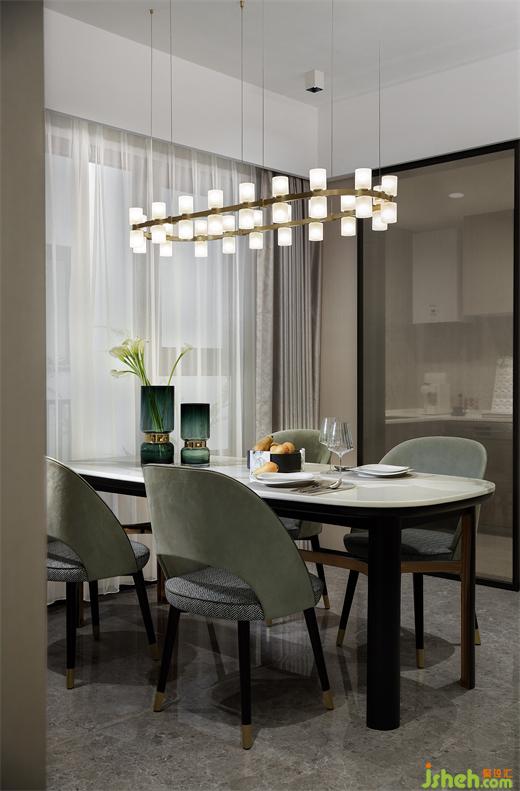 共聚一堂,共品一湯,也是一派溫馨之景。餐廳從淡雅的綠著手,圓弧的造型中和硬朗,南京樣板間設(shè)計(jì)配合協(xié)調(diào)的比例尺寸,釋放場(chǎng)域。又以古銅燈具做點(diǎn)綴,在暖光的映照下,盡顯輕盈之態(tài)。
