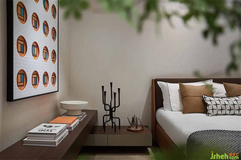主臥套間延襲主體基調(diào),南京樣板間設(shè)計(jì)以簡(jiǎn)而有序的藝術(shù)形式著筆,橙色貫穿始終,除卻外在的視覺(jué)呈現(xiàn),更有內(nèi)核的格調(diào)追求。地板采用人字拼手法凸顯層次,其趣味美感與細(xì)節(jié)推敲更顯設(shè)計(jì)功力。
