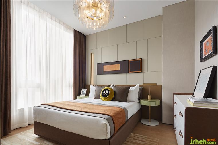 次臥以漸進(jìn)式的筆觸展開,床頭背景墻以體塊的劃分與拼接勾勒著起伏之韻,陳設(shè)布置則顯得輕松隨性,樣板間設(shè)計在多元材質(zhì)的交錯層疊中詮釋新的平衡美學(xué)。