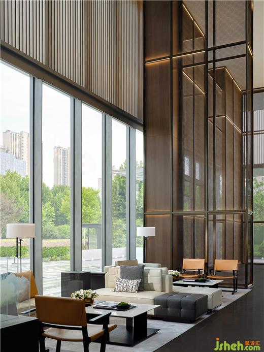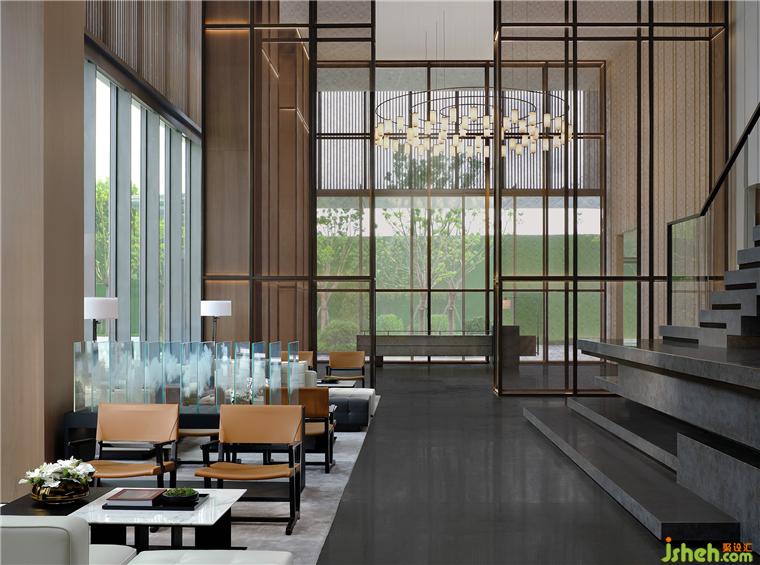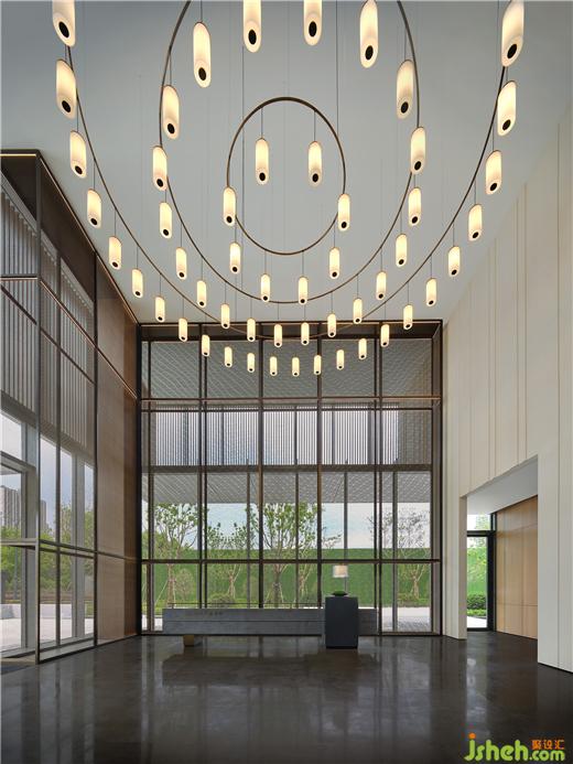高挑空前廳內(nèi)的定制金屬屏風(fēng)、木百葉與石材悄然間流露著東方意蘊,明朗且舒緩。售樓處設(shè)計吊燈則以圓形、線性、陣列式的重復(fù)元素強化儀式感,剛?cè)峒鏉?,一派包容之意,氣度非凡?