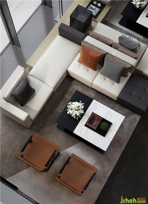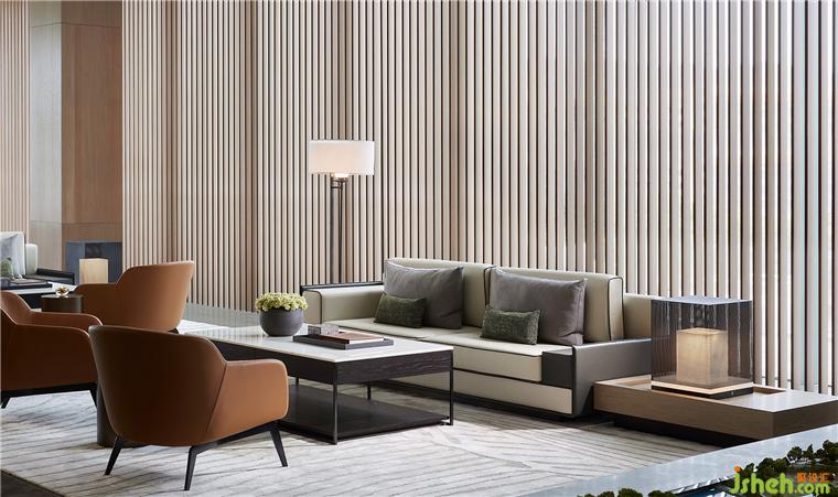 金屬線(xiàn)條延伸至休憩區(qū),這里不再大開(kāi)大合,典雅的色度引導(dǎo)著思緒沉淀下來(lái),落座一隅,溫柔交互,理想都市生活的情趣與自由縈繞四周。