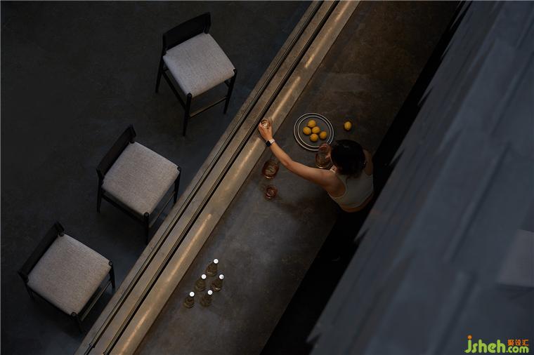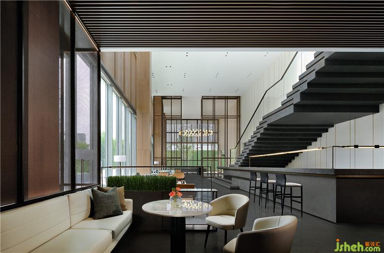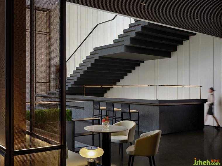 每一方寸都?xì)v經(jīng)反復(fù)推敲,將水吧臺(tái)順理成章的隱于樓梯之下,旨在探尋其最優(yōu)利用。售樓處設(shè)計(jì)借由體塊錯(cuò)位穿插,讓吧臺(tái)與樓梯表達(dá)著整體構(gòu)成,粗糲的石材與細(xì)膩的金屬融會(huì)貫通,則是對(duì)材質(zhì)、細(xì)節(jié)的延續(xù)以及因地因時(shí)制宜的演繹。