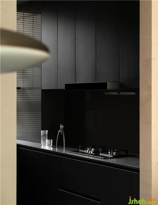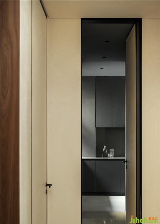 體貼周全的設計也離不開對廚房內外部的關系梳理。疊墅設計有效擴大原始廚房尺度,并增設雙通道步入模式,打開與公共區(qū)域的聯(lián)動。于內合理排布,提升實用效率,在暗黑靜謐的調性里,無聲流淌卓越質感。