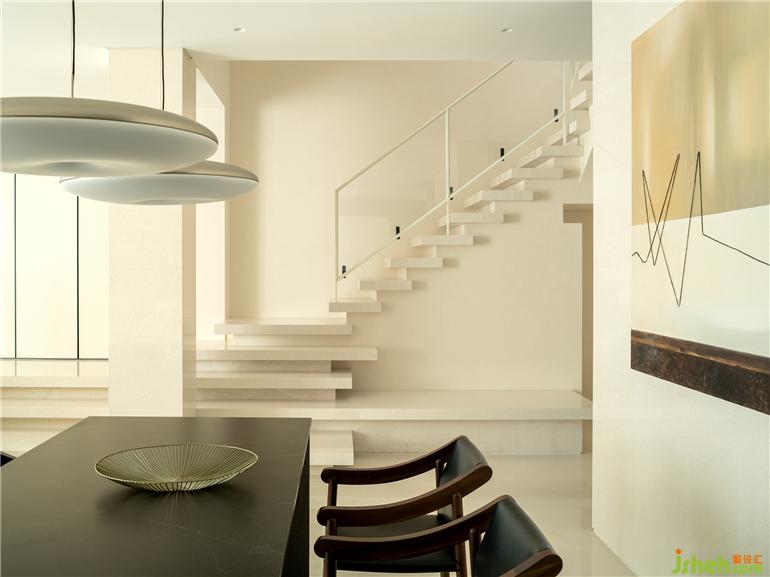 樓梯間從一層到三層縱向打通,套景手法也同步貫徹。兩個獨立的空間彼此延伸,規(guī)整和諧。三層則略顯外凸,交錯的體塊與嚴謹?shù)呐浔?,進一步彰顯著細膩的處理。