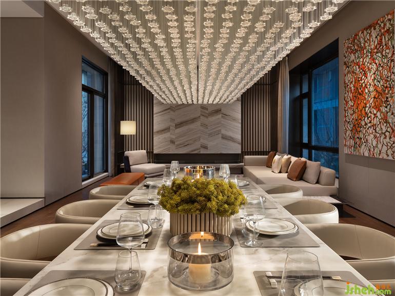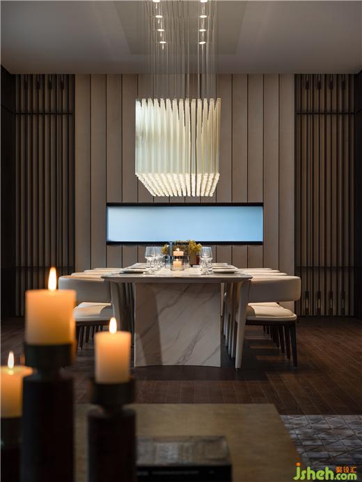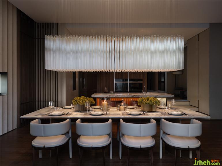 作為橫縱交互的中心點,餐廳更關(guān)乎彼此的響應(yīng)與關(guān)聯(lián)。借由千絲萬縷的緊密包裹與光芒散射,水晶通體管宛若立體藝術(shù)裝置,熠熠生輝,自成一景。常州天安別墅設(shè)計師以清晰的脈絡(luò)串聯(lián)起點、線、面、體,高低交錯、張弛有度,為用餐增添一抹空靈優(yōu)雅之韻。