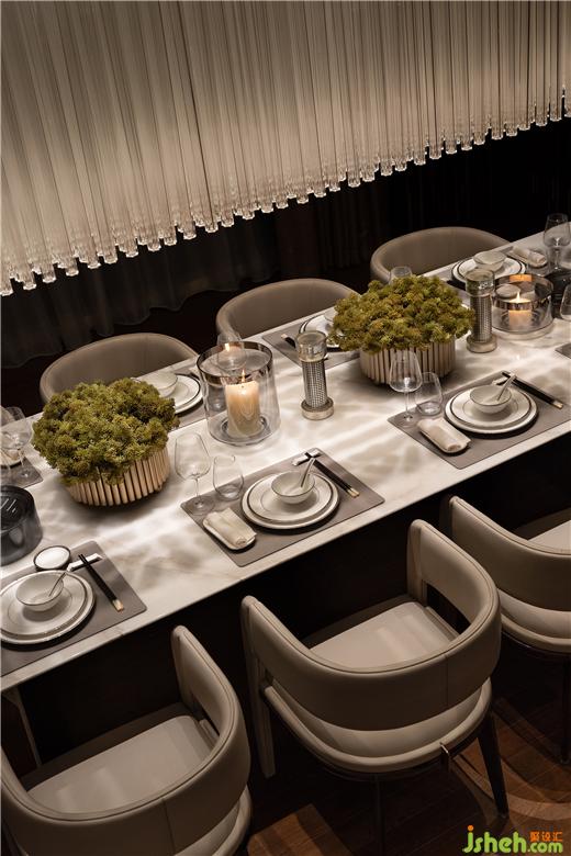 客餐廳于橫軸上聯(lián)動而設(shè),熟悉的金屬格柵對稱散布于四角,開闊大氣的東方格調(diào)不彰自顯。常州天安別墅設(shè)計背景墻石材對拼奠定客廳沉穩(wěn)俊朗的主基調(diào),軟裝陳設(shè)將大氣雅致與質(zhì)感表現(xiàn)相平衡,以期互補共生。燭火搖曳,美好愉悅氛圍也隨之渲染。