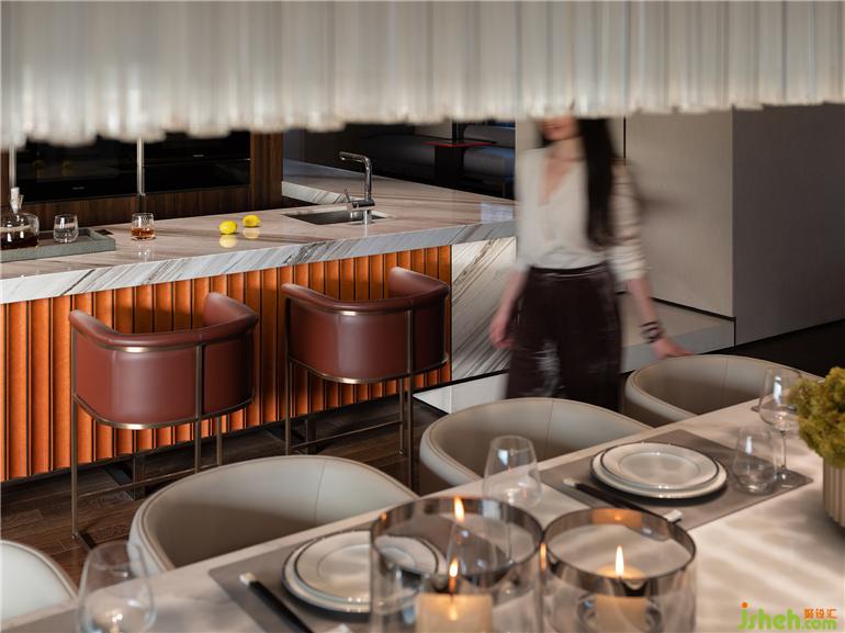 汲取設(shè)計元素的延續(xù),強化整體感受。拼疊有序、內(nèi)凹成勢、弧度起伏之貌同樣出現(xiàn)在吧臺,底座則運用金屬構(gòu)件又可削弱體量厚重感,對立與融合的張力亦潛藏于細部之中。