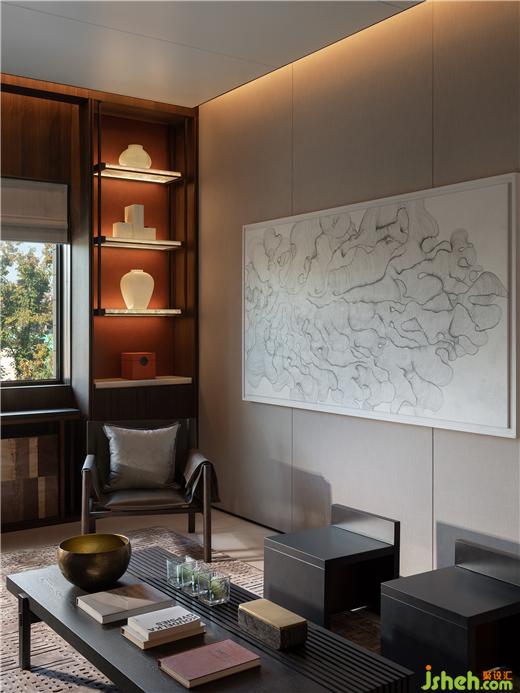 參照酒店式起居場景,于二樓構(gòu)造樞紐之地,套間居室環(huán)繞。常州天安別墅設(shè)計提取頗具東方意象的屏風(fēng)形態(tài),對沙發(fā)呈包裹姿態(tài),并以此開啟圍合布局。內(nèi)斂規(guī)整的低調(diào)秩序亦進(jìn)一步描摹酒店氣韻,透過陣列式陳設(shè)、高飽和色點(diǎn)綴,強(qiáng)化典雅之境。在深淺對比、錯落有致中,儀式感與隨性氣息兼具。