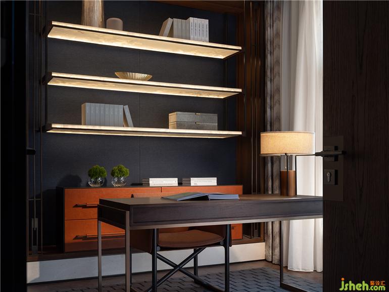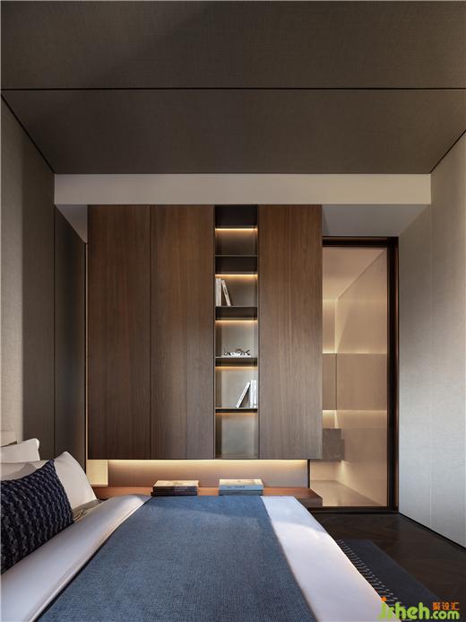 晚輩房套間以色調(diào)為觸點氤氳開靜謐安適氣息,又引入紋路、肌理的細(xì)膩呼應(yīng),常州天安別墅設(shè)計傳遞出克制的高級。懸浮柜體輔以內(nèi)嵌格架,并配與燈光烘托,豐富場景層級。