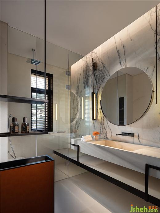 主衛(wèi)頂部設(shè)有天窗,借助光線變化塑造著微妙動態(tài),并讓這一隅實現(xiàn)室內(nèi)外的交融與對話。此外,鏡面的尺度、位置、造型,乃至圓弧的邊角處理,無一不凝聚著設(shè)計師對功能與美學(xué)的融匯捕捉。