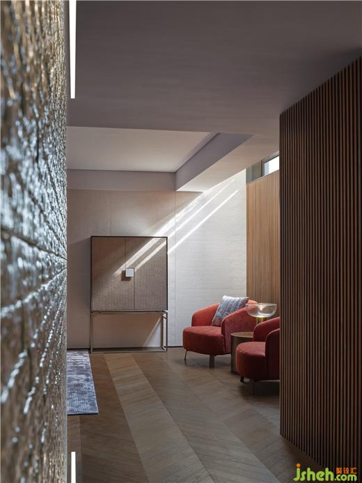 抵達(dá)地下一層,玻璃磚配合燈光的上下烘托,顯得愈發(fā)通透與醒目。遵循中國古典的步入方式,并體察視覺落點,漸漸揭開序幕,引導(dǎo)向前探索。