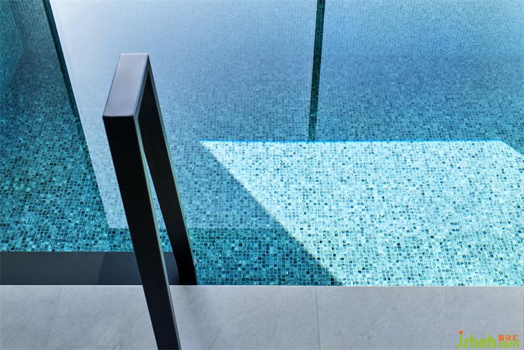 泳池隨陽臺順延而出,恰如精致的璞玉,深灰色馬賽克的獨特紋理,靜謐的倒影,度假居所設(shè)計讓寧靜和清涼沁人心脾。碧綠的藍天連接著透亮的水波,私家獨享暢游其中,無比自由愜意。