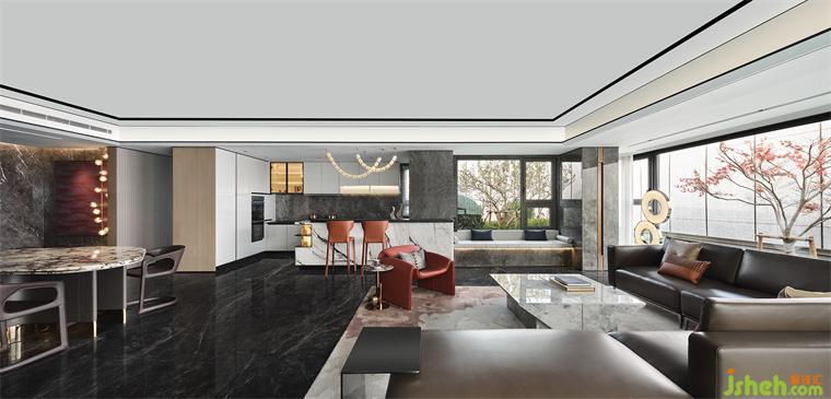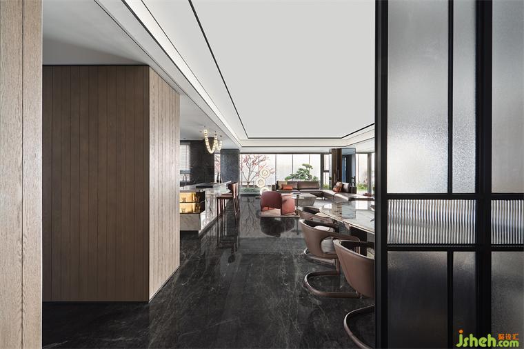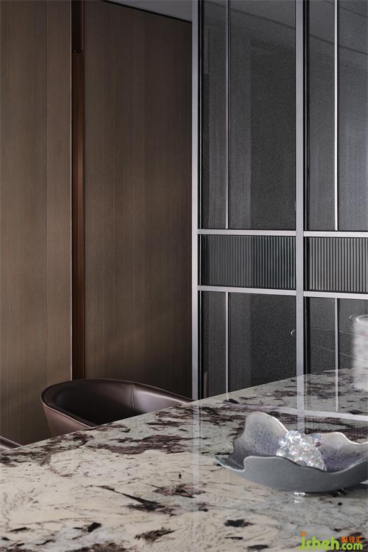 領先的LDKB一體化設計,將客、餐、廚、陽臺納入開放格局,樣板間設計合力打造出這頗為重要的“家庭會客中心”。于此融匯多種功能及場景,讓家不僅僅是生活的場所,也是社交陪伴的全能聚場。深灰石材與溫潤木飾的搭配,盡釋沉穩(wěn)高雅風尚。