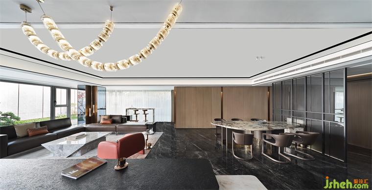 餐廳處的設計同樣利落從簡,一方石臺恰當?shù)慕?gòu)起與餐桌的起伏關系,在不斷延展的觸角之下,解碼更加立體多維的體驗,日常生活的閑適雅趣也于此盡情釋放。