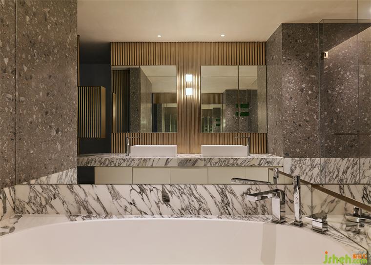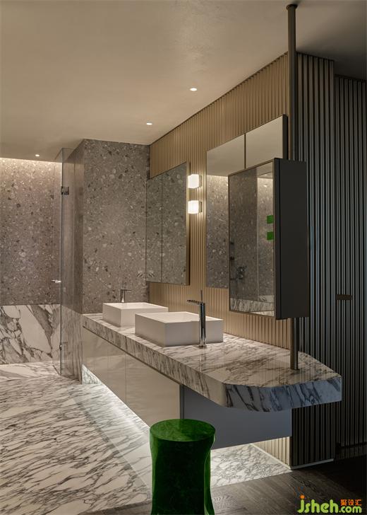 在難得的閑暇時(shí)光里,業(yè)主會(huì)泡在浴缸里休憩、看書。主衛(wèi)配備了多個(gè)鏡面,交疊映射,豪宅設(shè)計(jì)造就空間的無限延伸,現(xiàn)代性和未來感都得以強(qiáng)化。一個(gè)可旋轉(zhuǎn)的美妝柜,為女主人日常生活提供便捷。