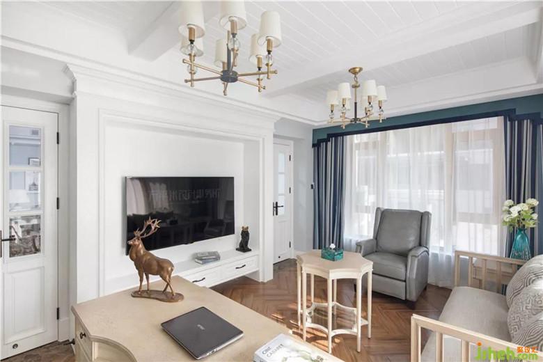 新建電視背景隔墻通過向客廳一側平移,使大尺寸電視掛壁安裝,取得舒適觀影體驗。