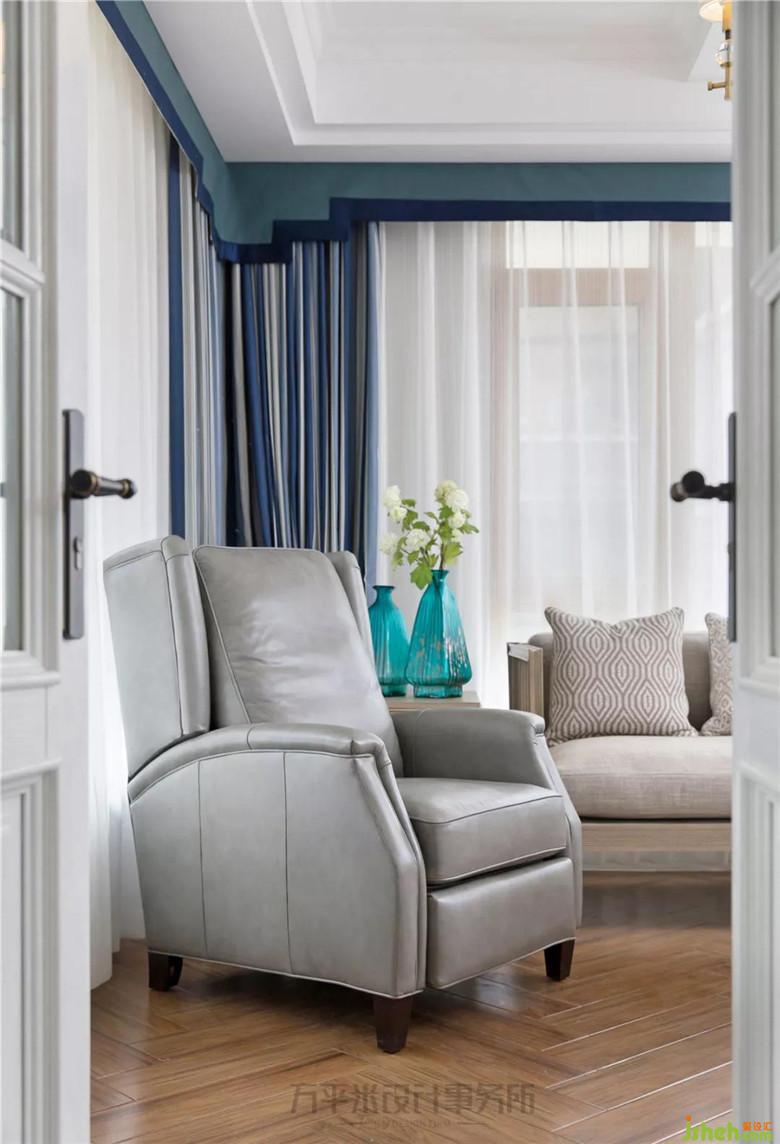 擺放淺木色布藝寬敞沙發(fā)主位,搭配可躺可坐的舒適功能單椅,相較開闊正式的客廳,明亮書房更宜成為一家人休閑上網、促膝交流或安靜共處的隨意自在空間。