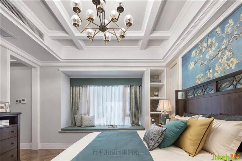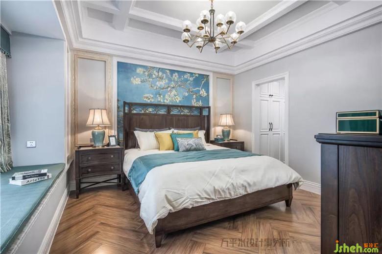青藍(lán)色調(diào)的墻紙,窗簾,床品,裝飾畫作及臺(tái)燈擺件等色彩柔和自然過(guò)渡,品味不凡。