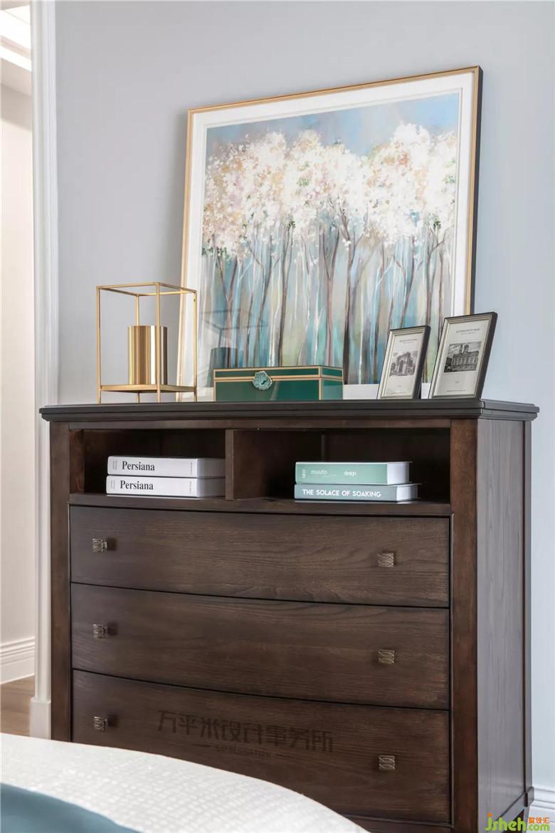 西曬小窗封住后以風(fēng)化白的原木造型圍鑲,杏花名畫圖案喻意芬芳恬靜的盎然生機(jī),將深咖色沉穩(wěn)原木家具安靜襯托。