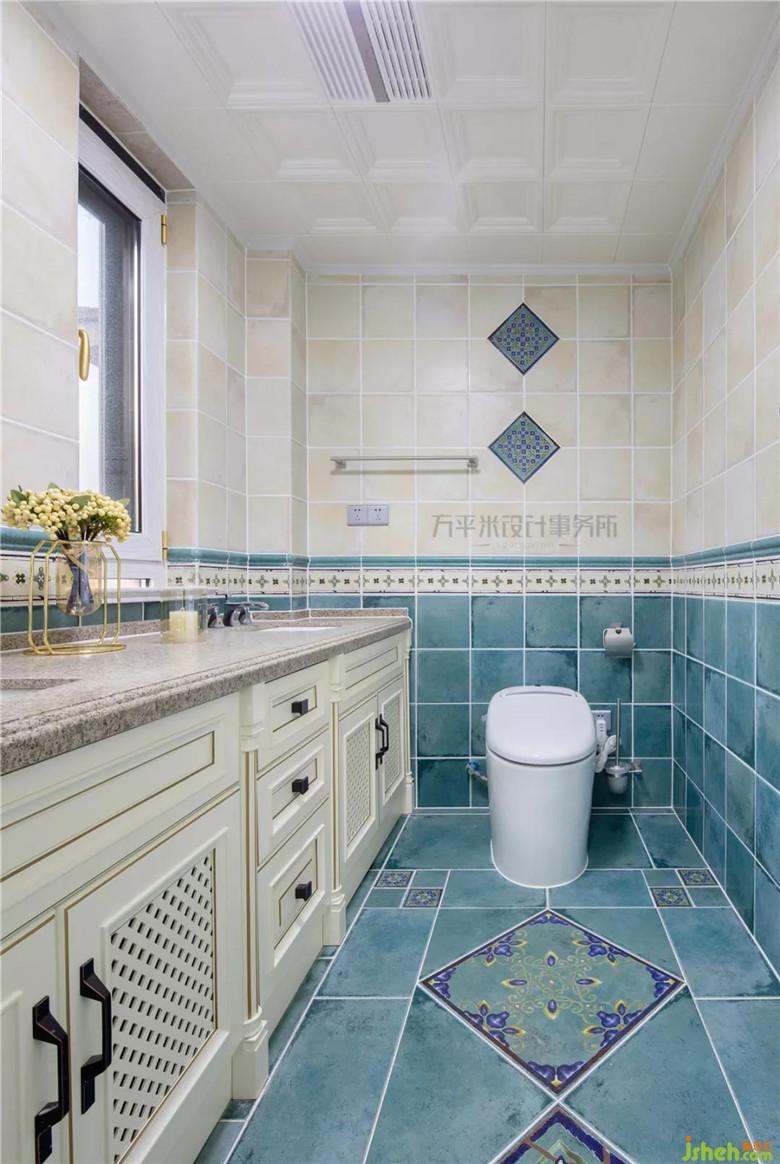 主衛(wèi)尺寸寬敞采取雙盆設(shè)計,分色仿古墻磚鋪貼,烘托原木定制浴室柜。
