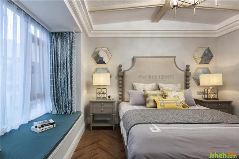 次臥為業(yè)主兒子的寬敞套間,因此在家具色彩上選用不同于主臥深咖色澤的淺灰色系,配以淺金與藍(lán)色調(diào)的布藝及裝飾品強調(diào)年輕活力感。