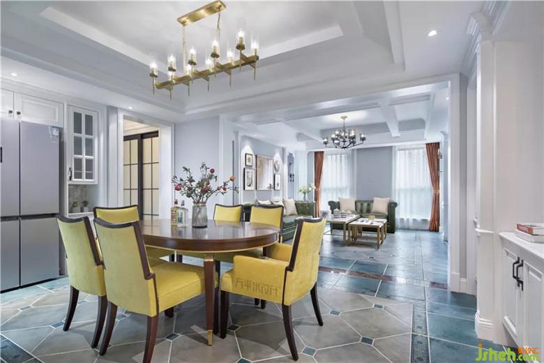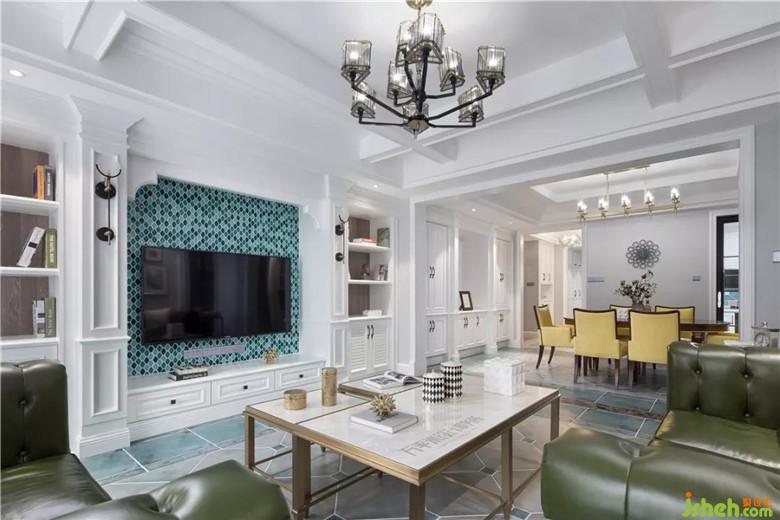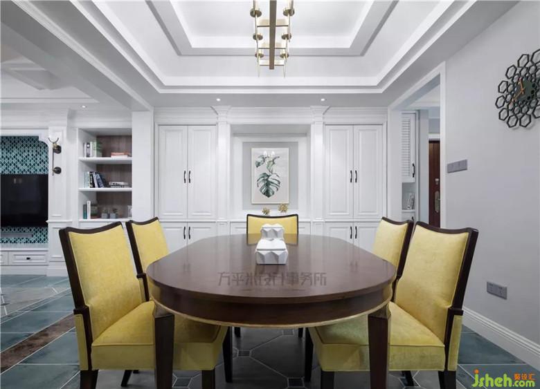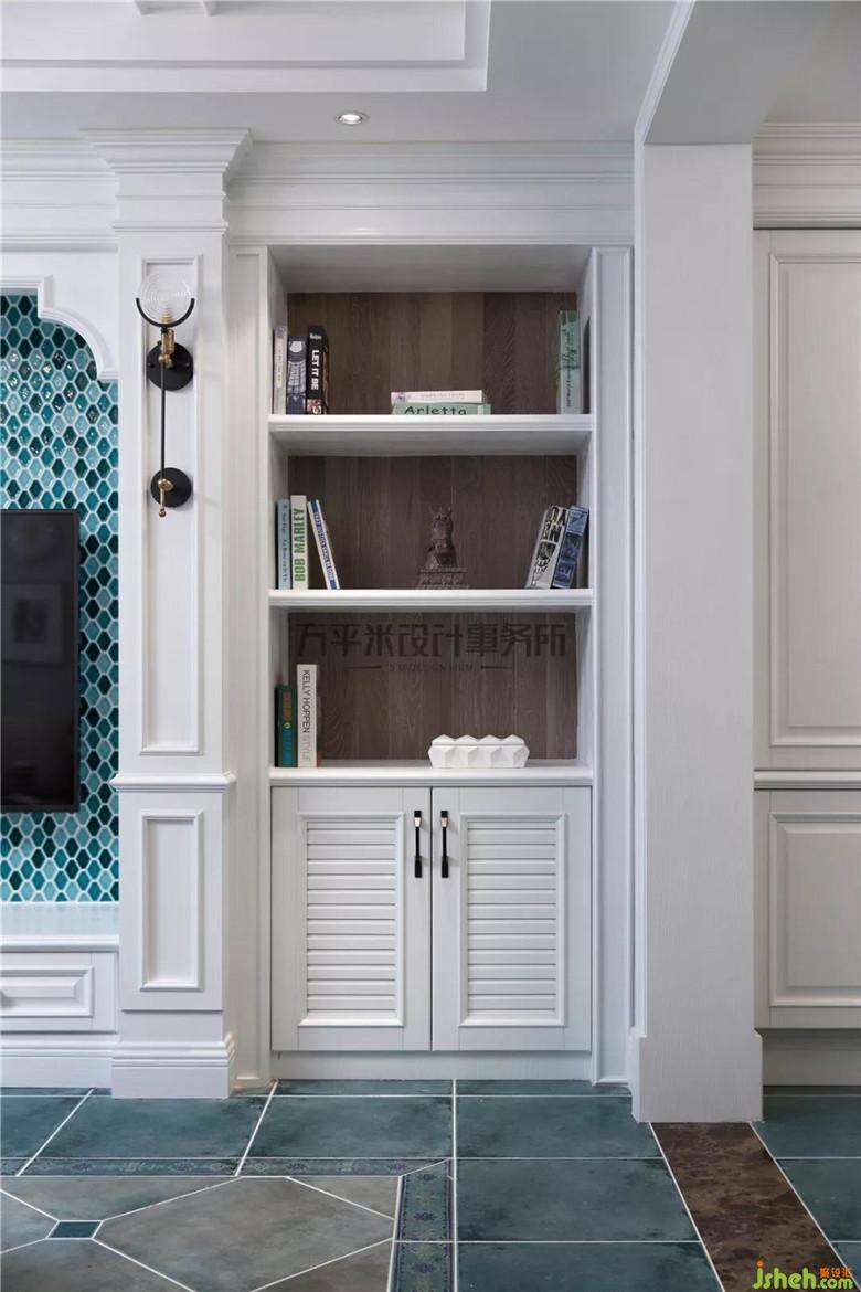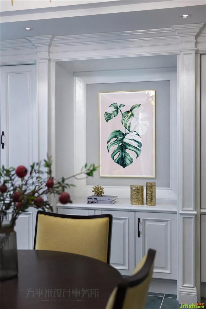 過道一側(cè)的墻面空間,依墻而設(shè)的滿墻儲(chǔ)物柜,考究比例分隔,以富有層次的典雅美式造型將中部留空,保留空間通透。