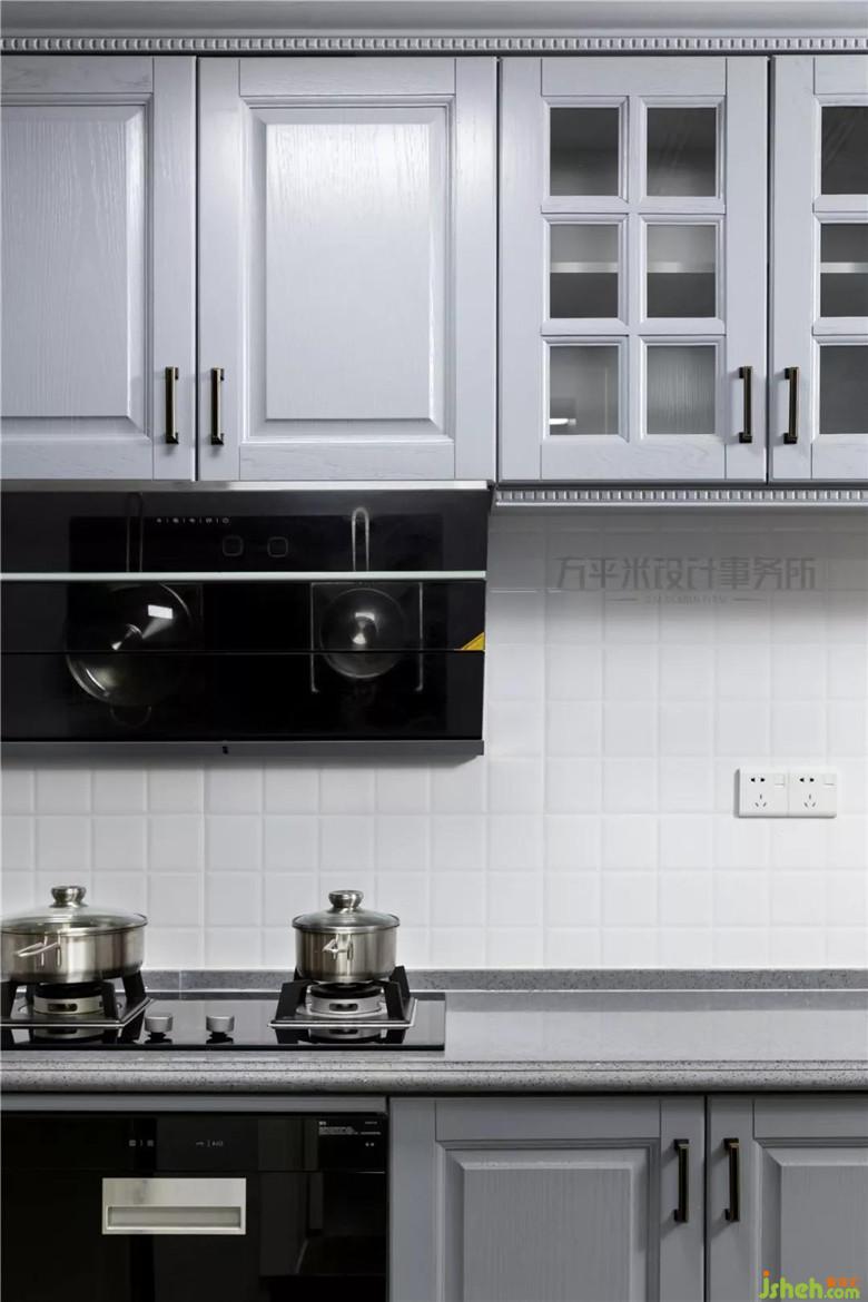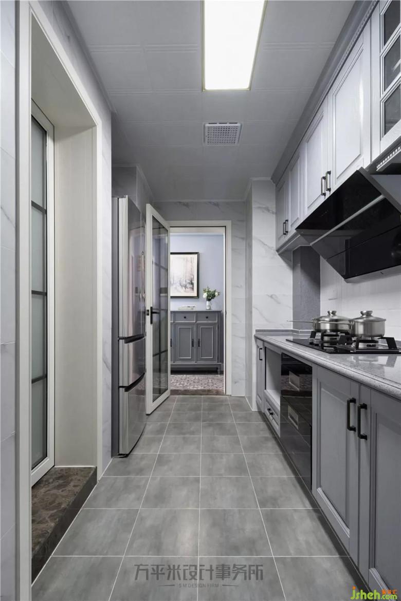 將隔墻砌出凹槽借用后方空間,使狹長廚房有了容納冰箱的合理區(qū)間。冰箱嵌入后不影響原櫥柜空間及通行動線。滿墻地柜及吊柜得以延長,提升收納功能也為洗切炒盛留出足夠操作尺寸。定制灰色櫥柜及同色臺面,搭配白色光潔小磚鋪貼。有清爽的高級感。