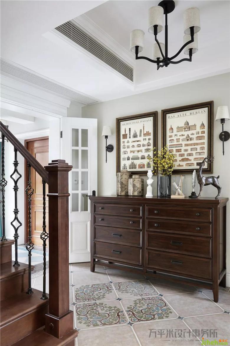 入戶門廳處制作坡面屋頂增添趣味。連續(xù)的造型門洞后左側(cè)是樓梯下空位置,作為未來規(guī)劃中寵物狗的小窩,現(xiàn)階段作為儲(chǔ)物間加以利用。內(nèi)嵌清玻的對(duì)開門把空間劃分,富有層次。輕柔陽光經(jīng)由挑空采光窗及南側(cè)景觀陽臺(tái)進(jìn)入屋內(nèi),使步入玄關(guān)后,即可感受大宅通透格局特有的開敞空間感。