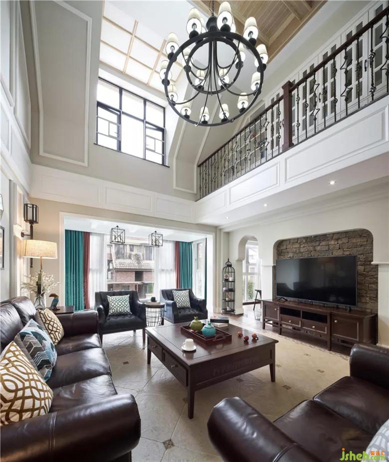窗外繁茂園林綠植如畫作裝點(diǎn),跟隨步伐悄然進(jìn)入視野,令人心曠神怡。挑高的頂面極大程度的保留,二層的采光窗令空間明亮通透?;揖G色墻面作為全屋基調(diào)倍感輕柔,濃郁墨綠及暗橙窗簾色彩碰撞,高級(jí)而生動(dòng)。電視墻兩側(cè)對(duì)稱的雙弧形門洞富有異國風(fēng)情,粗獷石材裝飾墻面,天然純粹。浪漫的鏤空鐵藝扶梯流暢延伸至二樓增設(shè)的書柜展示區(qū),上下兩層組成風(fēng)格統(tǒng)一且美觀實(shí)用的功能立面??桃庾雠f的風(fēng)化白造型木梁于頂面交錯(cuò),巧妙隱藏原梁。木質(zhì)本色隨意輕松的豐富頂面,平衡底部厚重視覺。