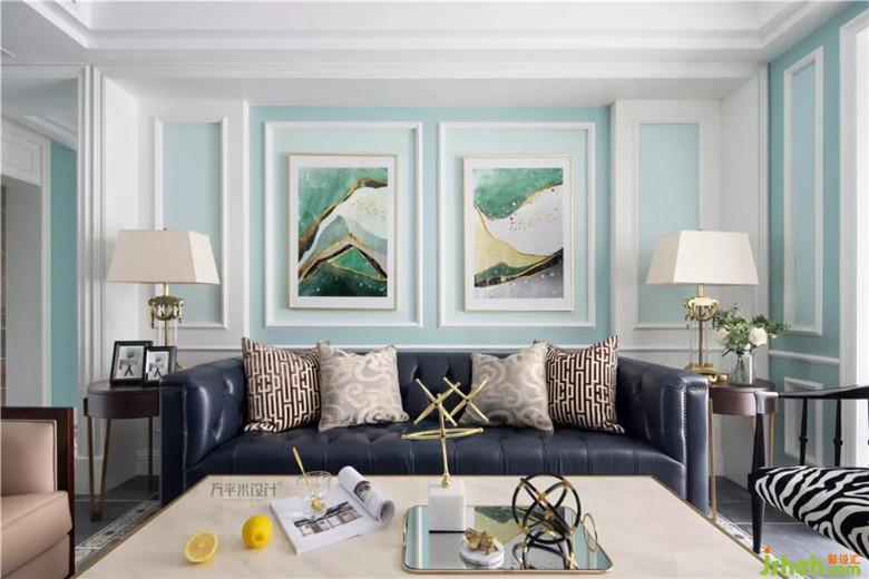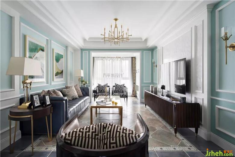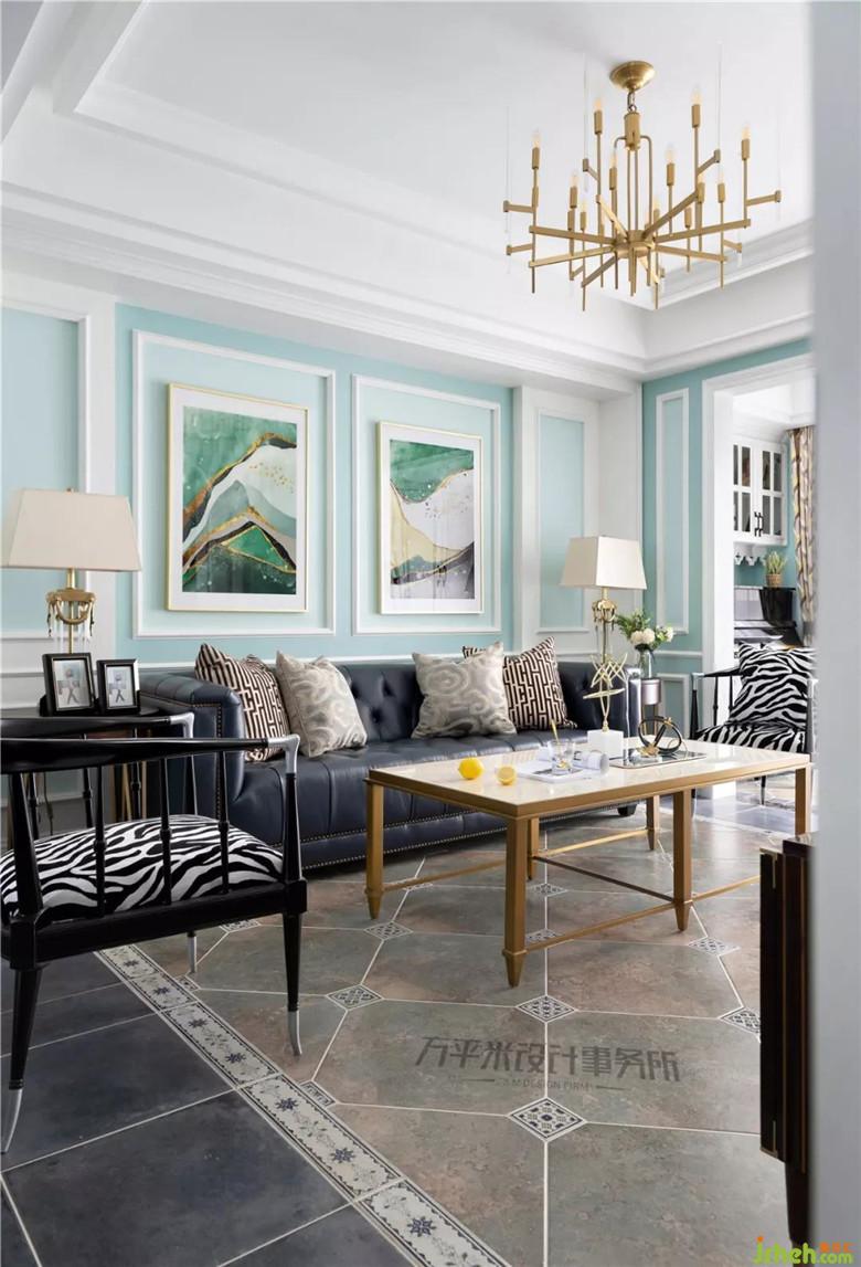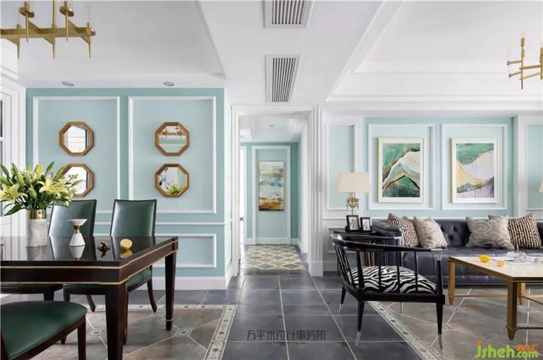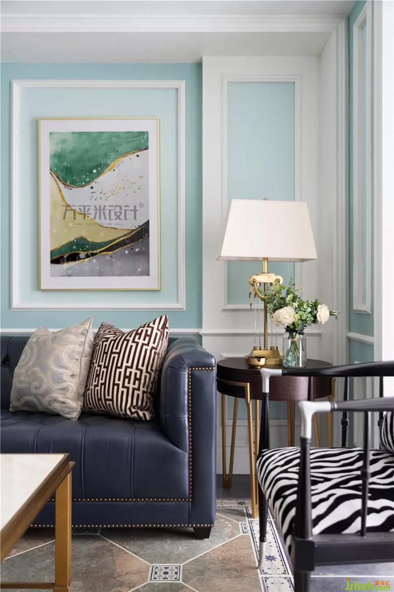 輕柔粉藍(lán)與薄荷綠墻面,純白木制勾勒,深淺漸進(jìn)將層次劃分,如海水微瀾,將淺淺波浪輕輕送抵海岸。安靜甜美的色彩語(yǔ)言,使歸家的心被溫柔撫慰,洗去一天忙碌的浮躁。精致黃銅元素,體量輕盈保持空間開(kāi)闊通透,金屬光澤傳遞特有高級(jí)質(zhì)感。四周深藍(lán)色地磚拼花與家具用色呼應(yīng),中心地毯區(qū)域大地色系增添溫暖感受。深藍(lán)定制沙發(fā),同色系沉穩(wěn)用色將重心壓低。而定制裝飾畫(huà)作恰如其分嵌入線框內(nèi)。于畫(huà)面色彩及比例分隔均呼應(yīng)全屋。